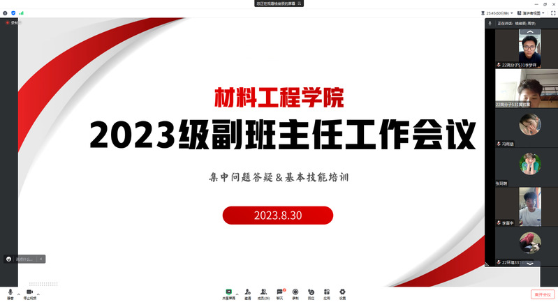 为进一步加强学院副班主任队伍建设,充分发挥朋辈榜样的引领作用,提高2023级新生副班主任班级管理水平,切实保障新生入学各项工作有序开展,8月30日下午,材料工程学院召开2023级新生副班主任线上工作会议。学院辅导员周宇、2023级新生辅导员王姝娴以及全体2023级新生副班主任参加会议。会议由周宇主持。