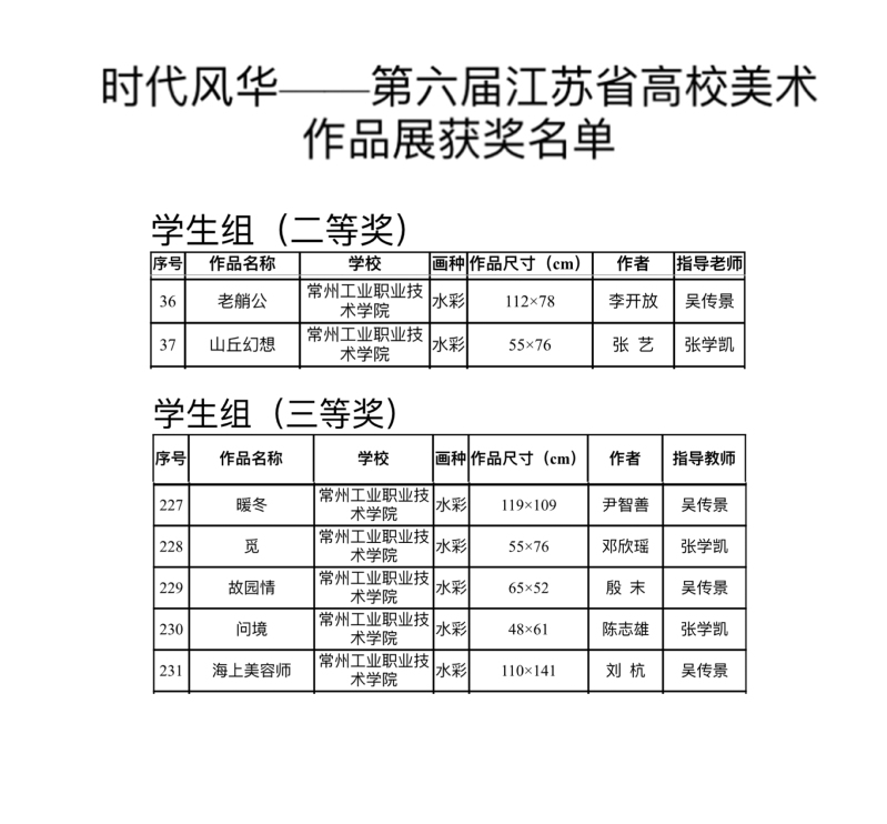 “时代风华”——第六届江苏省高校美术作品展共收到全省122所高校投稿作品4124件,作品种类涵盖国画、油画、版画、漆画、雕塑、插画、壁画、水粉、水彩等各画种。最终,评出学生组一等奖作品29件;二等奖68件;评出三等奖395件。我校学生水彩作品荣获二等奖2项,三等奖5项。