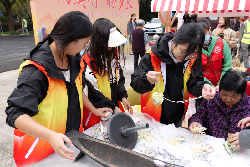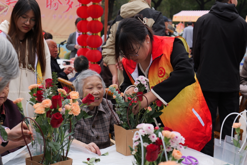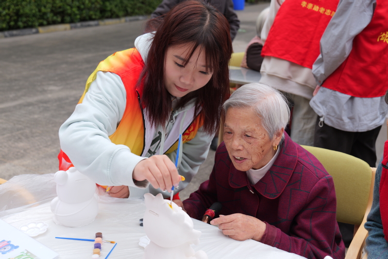 活动现场,老人们笑容满面,精神抖擞,志愿者们和爷爷奶奶们一起,围炉煮茶,听他们讲年轻时候的故事。在情浓重阳主题区,志愿者帮助警察们一起给老人们进行反诈宣传,帮助牙科大夫给老人们进行牙科义诊,还帮助护工给老人们进行艾灸服务;在活力重阳主题区,志愿者们辅助老人们参加“套住好运”的套圈游戏,用筷子夹住乒乓球放到杯子里的“‘筷’乐星球”趣味乒乓,还有“头脑风暴”的一起搭积木;在趣味重阳主题区,志愿者们带着奶奶们绘制自己的陶瓷娃娃,一起“花遇重阳”,巧手插花。