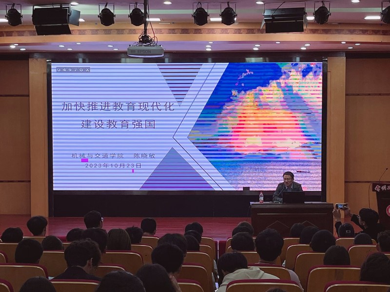 为进一步组织引导广大青年学生深入学习宣传贯彻习近平新时代中国特色社会主义思想和党的二十大精神,发挥党建带团建引领作用,高质量完成团校培训,10月23日,机械与交通学院团委开展团校开班第一课,邀请机械与交通学院党总支书记陈晓敏作开班第一讲,团课主题是《加快推进教育现代化,建设教育强国》。这堂团课如同一场思想的盛宴,让青年学生们对现代化教育和教育强国有了更深刻的认识。