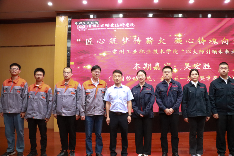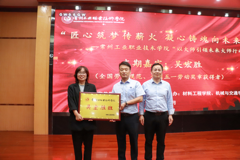 邓建军工匠学院院长袁飞、机械与交通学院院长徐伟共同为吴宏胜颁发了学校“以大师引领未来大师行动”师徒结对导师,青年教师传帮带导师聘书。吴宏胜和材料工程学院院长滕业方一起为23高分子531班授予“吴宏胜班”班牌,希望该班的同学们能够在实践中练就过硬本领、培育精益求精的工匠精神。