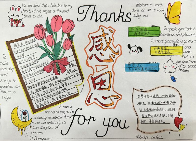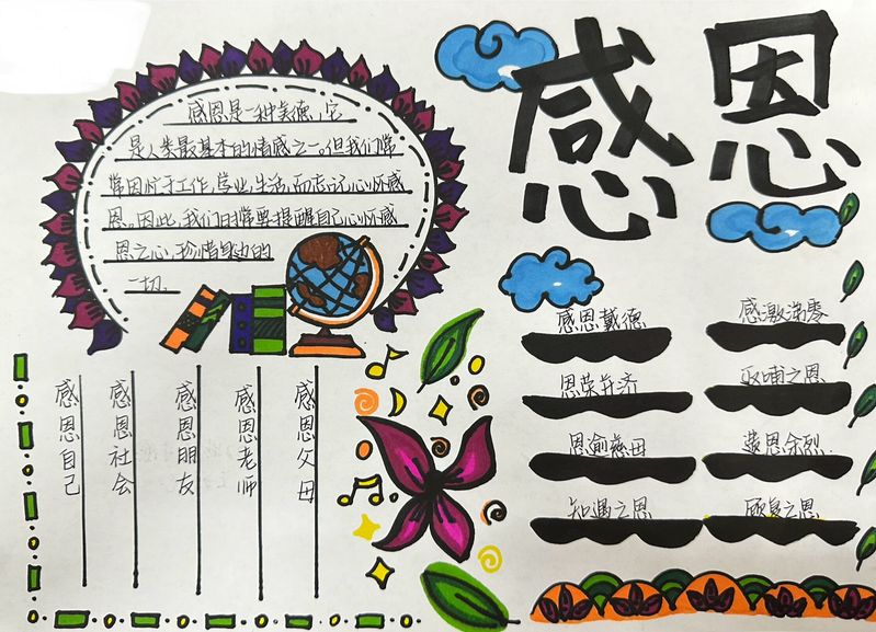 此次活动得到了同学们的积极响应,收到作品三十余幅。参赛学生充分发挥想象力,搜集相关资助政策、名人名言等资料,认真整理设计,用纸笔生动地描绘了他们对诚信、感恩、励志的认识。本次比赛上交的作品,主题突出、构图合理、色彩鲜艳、风格不一,有的排版简洁明了,线条流畅;有的使用了马克笔、彩色铅笔、油画棒等不同绘画工具,富有层次感以及视觉冲击力,将自己的感恩之情以及励志之志融入在了手抄报中。