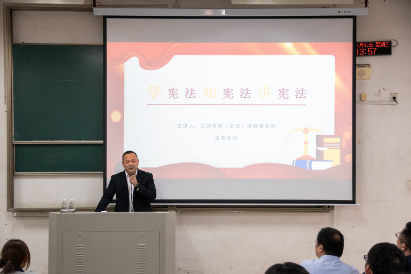 为深入学习贯彻党的二十大精神和习近平法治思想,进一步推动宪法学习宣传教育走深走实,营造浓厚的校园法治文化氛围,11月1日下午,数字商务学院邀请江苏常明(武进)律师事务所张革律师来校开展“学宪法,讲宪法”专题讲座。数字商务学院党总支副书记马军、吴佳伟,学生党支部全体教师党员、学生代表共120余人参加了讲座。