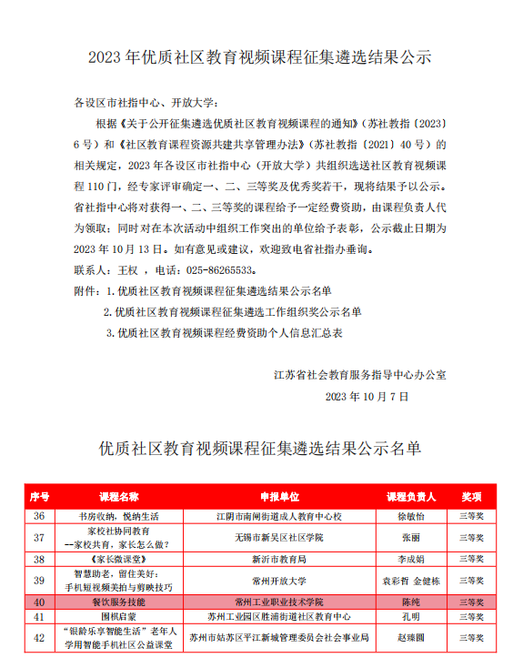 近日,江苏省社会教育服务指导中心办公室公布了2023年优质社区教育视频课程征集遴选公示结果,旅游与康养学院院长陈纯主持的《餐饮服务技能》视频课程,经学校申报,专家评审后,获评“2023优质社区教育视频课程征集遴选”三等奖,这也是学校首次在省级社区课程评选中获奖。