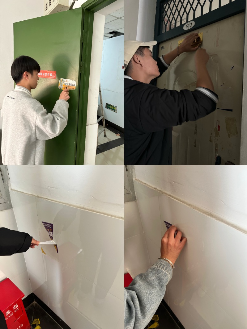 此次党日活动主要是对公寓宿舍门上不文明门牌进行清理,倡导宣传文明和谐的公寓文化和氛围;更换学院门牌信息纸,标注好班级、班主任、舍长、舍员等信息,便于学生查寝和宿舍信息管理;清理公寓公共区域、楼道、楼梯等地方的卫生死角,给同学们提供一个干净整洁的住宿环境。大家分工明确、同心协力、团结合作,前期做好任务分工和物资分配,两人一小组负责一个楼层,清理不文明门牌,分发张贴新的宿舍信息纸。分组分区对学生公寓九、十号楼整体公共区域、楼道、楼梯以及宿舍门口等地的卫生进行清洁。同学们一边忙活,一边交流学习生活经验,时有欢声笑语,现场一片和谐。