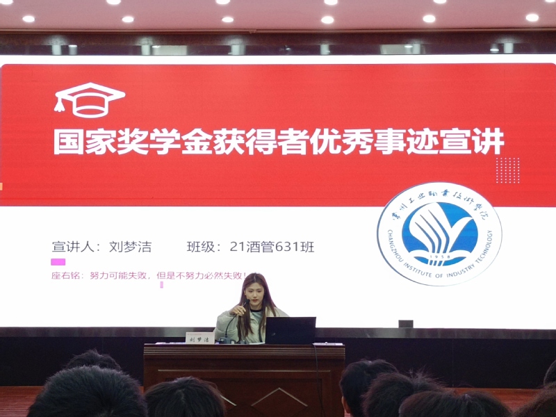 国家奖学金获得者21酒管631班刘梦洁同学,讲述了她获得江苏省职业院校技能大赛旅游类餐厅服务赛项高职组一等奖以及全国职业院校技能大赛高职组酒水服务比赛团体二等奖在备赛过程中的励志故事,鼓励同学们志存高远,全面发展,勤奋刻苦学习,热爱所学专业,促进自己能力的全面提升。