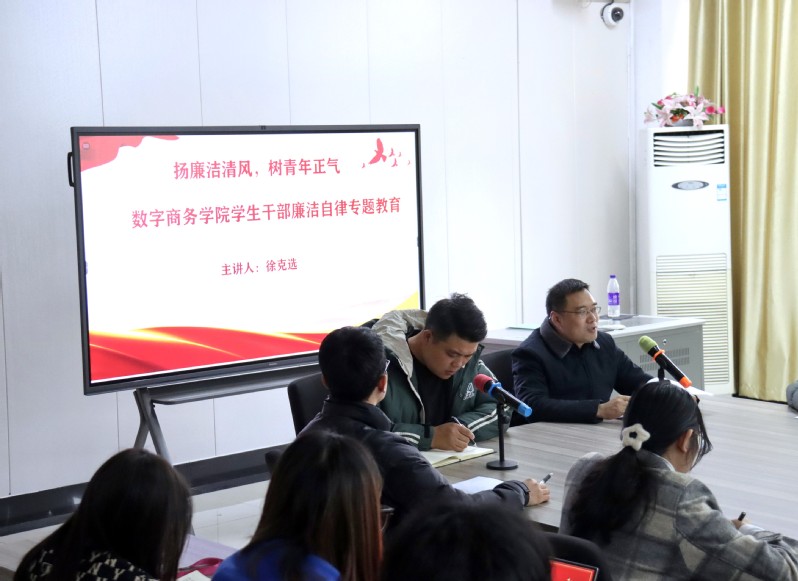 为进一步提高学生干部廉洁意识,激发学生干部队伍廉洁担当定力,提升学生干部率先垂范能力,11月16日,数字商务学院召开学生干部廉洁自律专题教育。数字商务学院党总支副书记马军,团委书记徐克选以及学生干部代表参加活动。