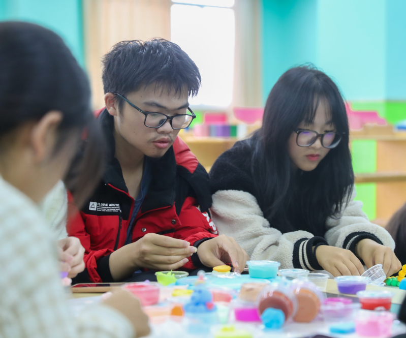 活动开始前,来自“旅途驿站”的朋辈互助员对活动流程进行了详细介绍。活动采用视频的方式展示作品要求,作品创作围绕“宿舍关系”和“美丽校园”两大主题,要求全体同学运用“压、搓、捏、团、揉”等技法,从造型、色彩、装饰等方面对作品进行塑造。在实践环节,同学们根据朋辈互助员的引导,充分发挥自己的想象力,通过一步步的“揉、搓、捏、贴”等动作进行“宿舍关系”和“美丽校园”主题创作,在同学们的精心制作下,一个个活灵活现、形象逼真、志趣盎然的手工作品初具雏形,展现了同学们丰富的内心世界。心理协会的崔佳萌同学说:“粘土虽小,但创意无限,通过体验粘土创作,培养了我们的动手能力、创造力和专注力,让我们在繁忙的学习生活中找到返璞归真的童趣,体验着用双手创作带来的舒适与享受。”