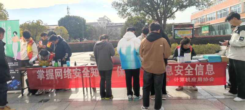 11月30日,信息工程学院计算机应用协会在一食堂门口开展网络安全宣传暨计算机义诊活动。计算机应用协会15位同学参与了本次活动,活动吸引了将近500名同学参加。