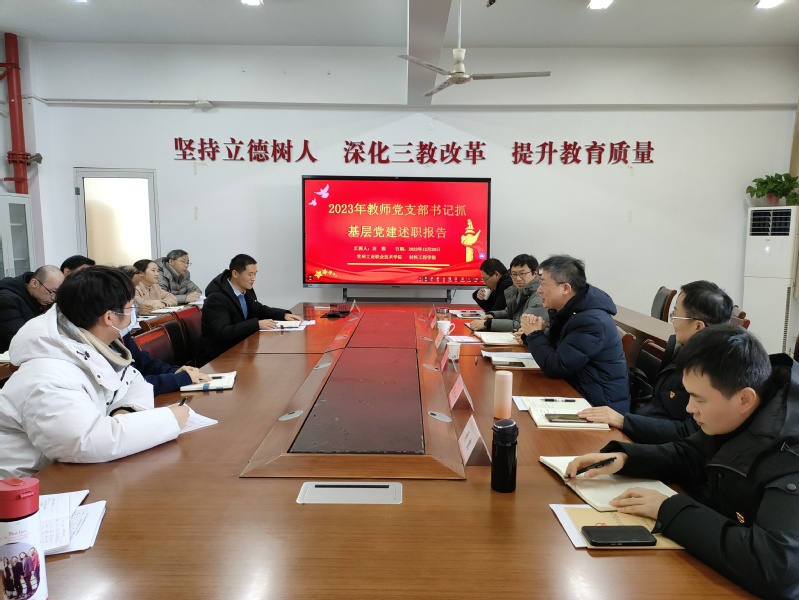 教师党支部书记汪熙从支部主要工作与成效、存在问题、下一步的工作思路与措施等方面进行述职汇报。2023年,材料工程学院党总支教师党支部紧紧围绕新时代高校党建“双创”工作重点任务指南,对标“七个有力”,积极践行党建引领发展、党风促进教风的基层党组织建设理念,充分发挥我院教师支部的战斗堡垒作用和教师党员的先锋模范作用。支部从“观、听、读、行、讲”等五维度,通过党员自学、党员代表领学、党支部书记带头讲党课等多种渠道和方式加强支部政治理论学习,扎实推进主题教育常态化制度化。教师党支部坚持高标准高质量开展“闻香识药不忘初心”“‘两湖’创新区规划展示馆参观”“非公企业党建示范基地交流”等特色党日活动,突出政治学习和党性锻炼,增强支部党员理想信念教育实效性。