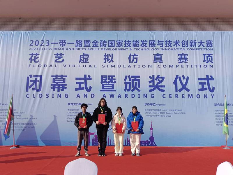 近日,2023“一带一路”暨金砖国家技能发展与技术创新大赛花艺虚拟仿真赛项在河南林业职业学院隆重举行。来自全国26个省、市、区、104所院校,800余名领导、专家、裁判员和参赛选手参加了盛会。艺术创意学院高度重视,师生积极筹备。经过数月的认真训练,通过现场激烈角逐,学生孙思雨、麻语桐稳定发挥,荣获一等奖。査智豪、殷未获得三等奖。蒋竹鸣、胡成成获得优秀指导教师荣誉。