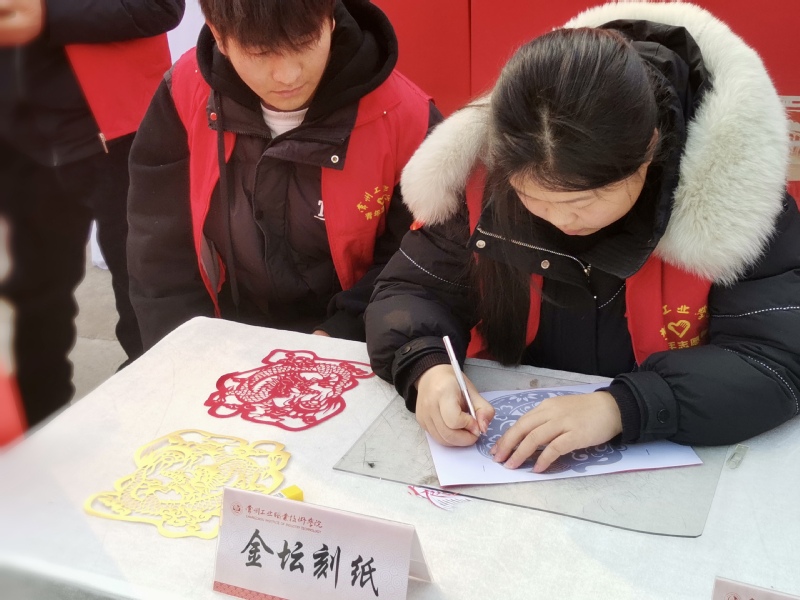 来自艺术创意学院的师生们实地演示了金坛刻纸的步骤和技艺,他们以刀代笔,展示指尖艺术,以纸为媒,摹写文化之魂,巧妙的构思、精湛的技艺,处处彰显传统非遗艺术的独特魅力。一张张精美生动的龙年主题刻纸跃然而出,绽放出浓浓的年味,传递着新春的祝福。