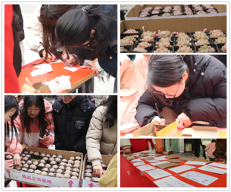 绿之源协会在校内设立绿植发放站点,大家积极参与绿色植物领养行动,并将绿色环保宣言写在便签条上,为环保种植、热爱生命发声,共同庆祝“三·八”国际妇女节。活动过程中,协会成员引导同学们关注自身道德修养、成长发展、心理健康等方面,正确看待和审视自我,在春暖花开的季节里,种下属于自己的一片绿色。与此同时,同学们变身妙手花匠,为在校女教师们送上温馨绿植以及节日的祝福,传递绿色与感恩,分享爱与美好。