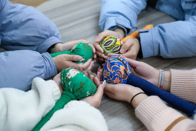 活动中,辅导员给大家介绍了艾草锤的养生功效、制作材料以及制作方法。处理艾草、捏紧团球、放置支撑辊、棉布包裹、棉线缠绕,一系列听起来简单的步骤做起来却大有门道。在制作过程中大家相互交流,相互帮助,在一片欢声笑语中,一个个花色不一的艾草锤就制作完成了。