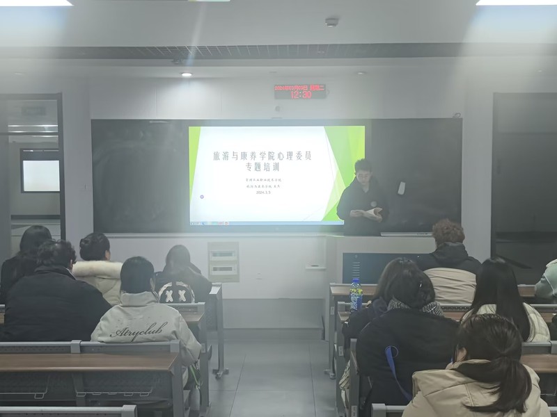 为更好地推进学校心理健康教育工作,加强班级心理委员队伍建设,充分发挥朋辈互助的力量,3月5日,旅游与康养学院开展了“心存美好,从新启航”心理委员培训活动。培训由心理辅导员王杰主讲。