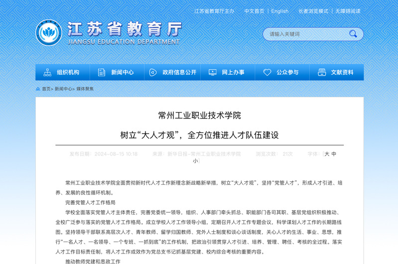 江苏省教育厅·媒体聚焦:常州工业职业技术学院:树立“大人才观”,全方位推进人才队伍建设
