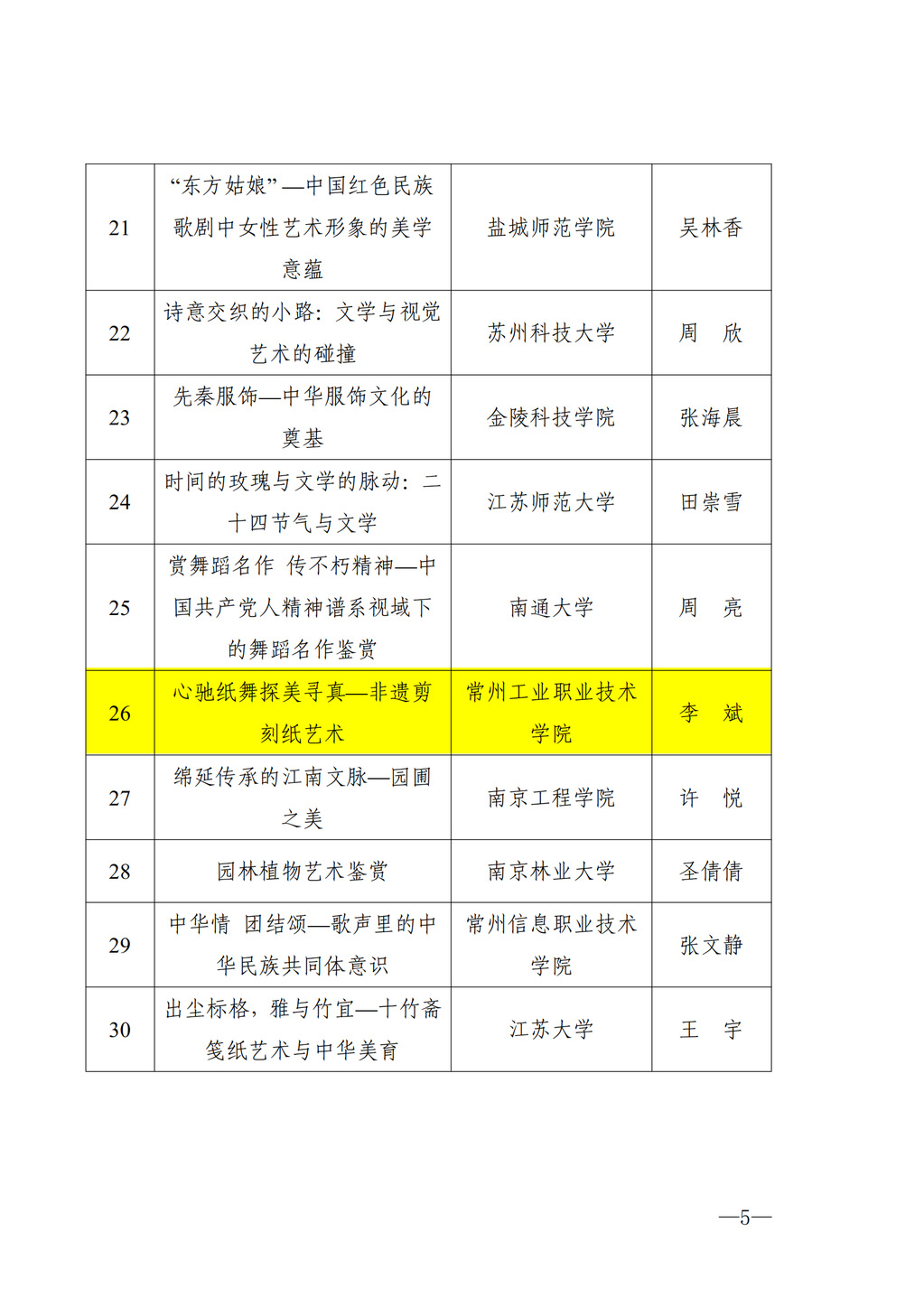 近日,江苏省教育厅公布《省教育厅办公室关于公布2024年江苏省高校美育大讲堂优课名单及预约2025年授课的通知》(苏教办体艺函〔2024〕18号),我校报送的课程《心驰纸舞探美寻真—非遗剪刻纸艺术》成功入选。本次优课评选,全省本专科院校共提交154门课程参评,经省教育厅组织省外专家初评、复评,最终遴选出30门课程为2024年江苏省高校美育大讲堂优课。