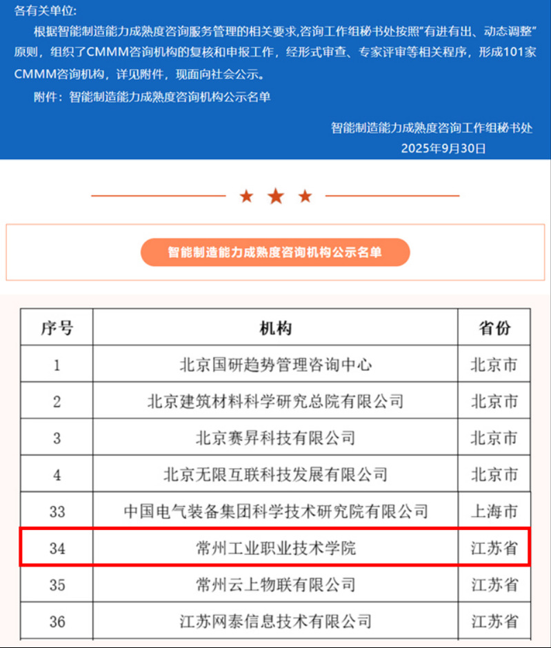 运用该模型对外权威提供相关服务是需要资质的,分为咨询机构和评估机构。其中,咨询机构的评选由咨询工作组秘书处按照“有进有出、动态调整”的原则,从机构资质、团队资历、智造解决方案、标准推广经验、核心竞争力、领域知识产权、领域知识库、咨询成功案例、行业影响力等维度对新申报机构进行评审、对已入选咨询机构进行复核,定期更新咨询机构名单。截至目前,全国共有101家机构入选,其中江苏省25家,常州市3家。本次我校也是常州地区唯一新增的咨询机构。