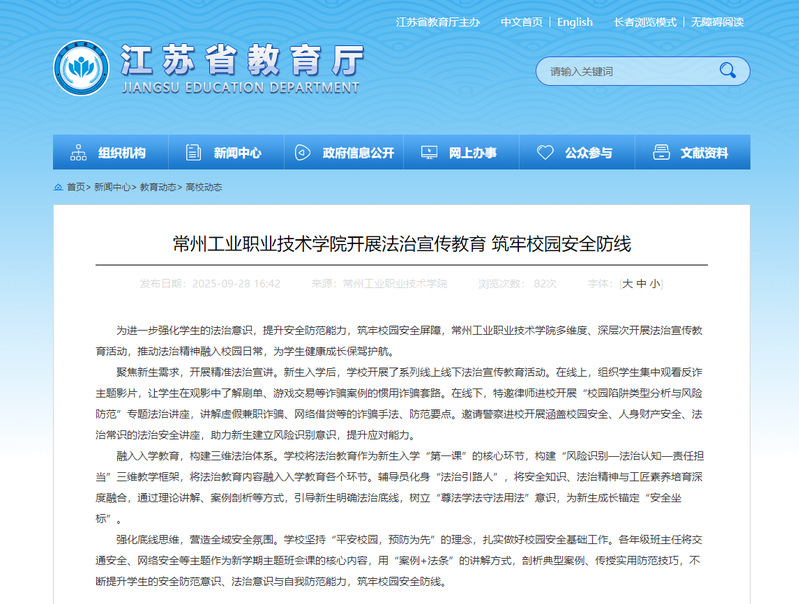 江苏省教育厅:常州工业职业技术学院开展法治宣传教育 筑牢校园安全防线