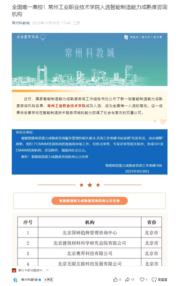 常州科教城:全国唯一高校!常州工业职业技术学院入选智能制造能力成熟度咨询机构