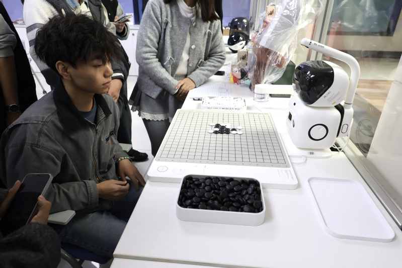 随后的“产品体验与趣味活动”环节将整个活动推向高潮。社员们自由探索展馆内的各类智能设备,并积极参与“五子棋人机PK赛”。现场氛围活跃,同学们在与AI的智慧对弈中展现出浓厚兴趣,优胜者还获得了精美礼品。