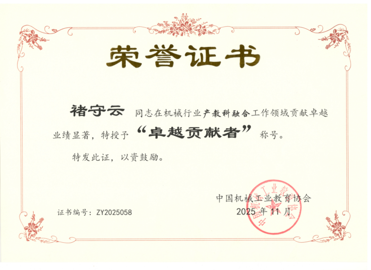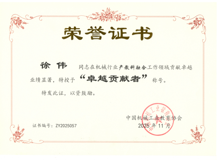 近日,在中国机械工业教育协会组织的机械行业产教科融合高质量发展评选中,我校褚守云、徐伟两位教授凭借在产教融合领域的深耕实践与突出成就,荣获机械行业产教科融合工作“卓越贡献者”称号。