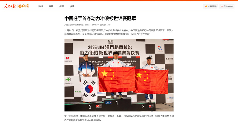 人民日报客户端:中国选手首夺动力冲浪板世锦赛冠军