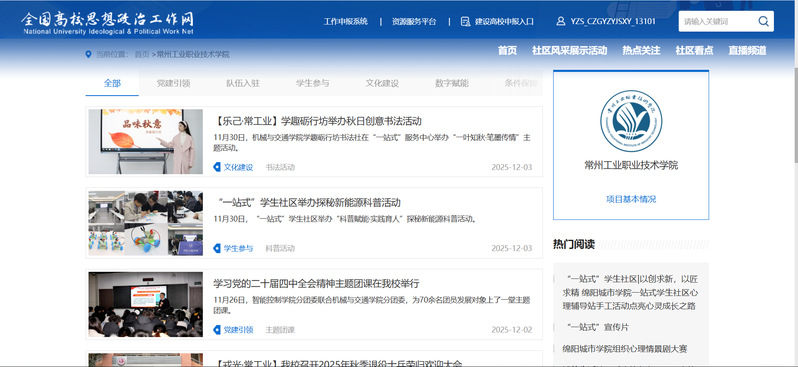 自2025年3月我校获评全国高校示范“一站式”学生社区以来,学校高度重视学生社区建设工作,始终以习近平新时代中国特色社会主义思想为指导,构建党建引领、队伍入驻、学生参与、文化浸润、数字赋能的“五位一体”工作体系,推动育人资源集聚、思政力量下沉,努力打造协同育人的新格局。学校以党建引领筑牢根基,将党建工作延伸至社区,落实校院领导“一线规则”,深入践行师生“同吃同住同成长”理念;以“守望·常工业”为核心理念,构建“工匠精神+感恩知责”的社区文化浸润体系,打造了“求是、同行、金盾、乐己、永助、戎光、礼耀”等一系列品牌项目;在治理服务方面提质增效,建立了学生诉求线上反馈机制,搭建自主管理网格与学生自治组织,打造社区朋辈育人阵地。