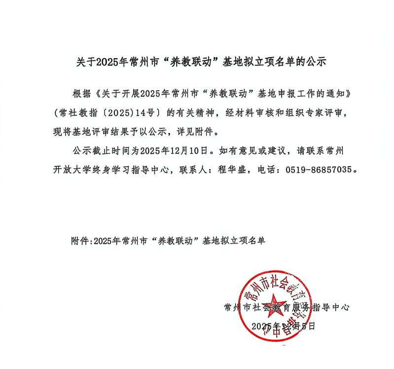 近日,常州市2025年度“养教联动”基地申报创建结果揭晓,我校凭借与橄榄城社区深度合作开展的系列老年教育活动,从众多申报单位中脱颖而出,成功入围市级示范基地创建名单,这也是对我校践行“服务全民终身学习”理念的生动肯定。