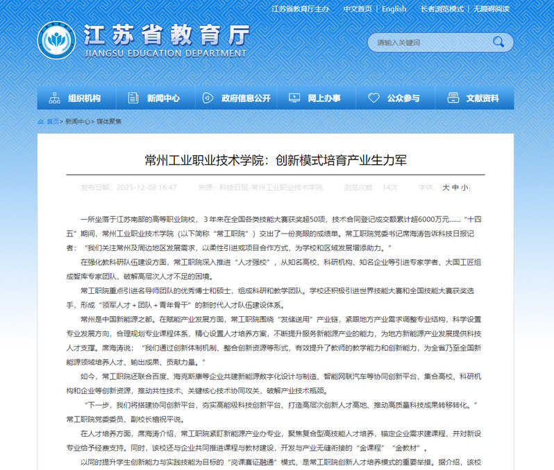 江苏省教育厅·媒体聚焦:常州工业职业技术学院:创新模式培育产业生力军
