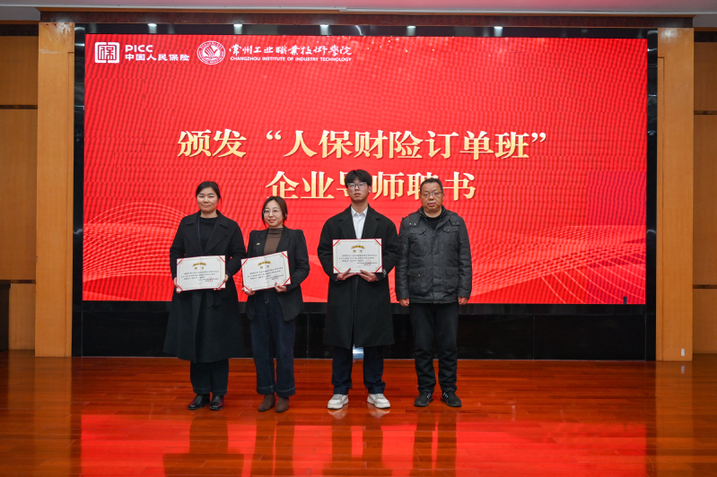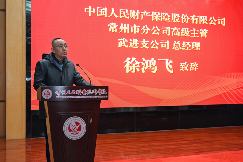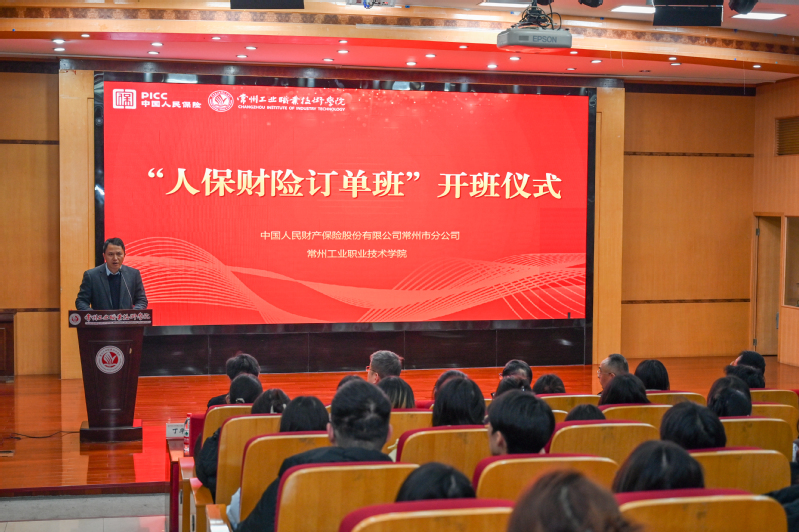 12月9日,中国人保财险订单班开班仪式在我校举行。中国人保财险常州市分公司高级主管兼武进支公司总经理徐鸿飞、副总经理徐可达,我校副校长檀祝平、蒋正炎出席活动,共同见证校企协同育人新起点。会议由数字商务学院院长施新平主持,金融服务与管理专业全体师生参加了本次会议。