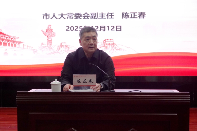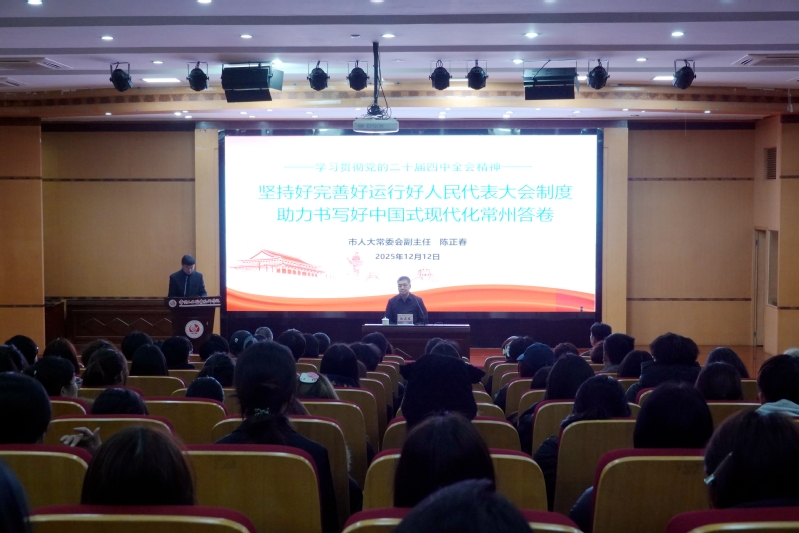 为深入贯彻落实党的二十届四中全会精神和习近平总书记关于加强高校思政课建设的重要指示精神,12月12日,常州市人大常委会副主任、党组成员、一级巡视员陈正春同志应邀来校,为师生讲授专题思政课。活动由校党委副书记吴丽云主持。常州纺织服装职业技术学院党委书记林刚、宣传部部长夏斌带领该校120名学生到场交流学习。我校各党总支书记及120余名学生代表现场聆听。