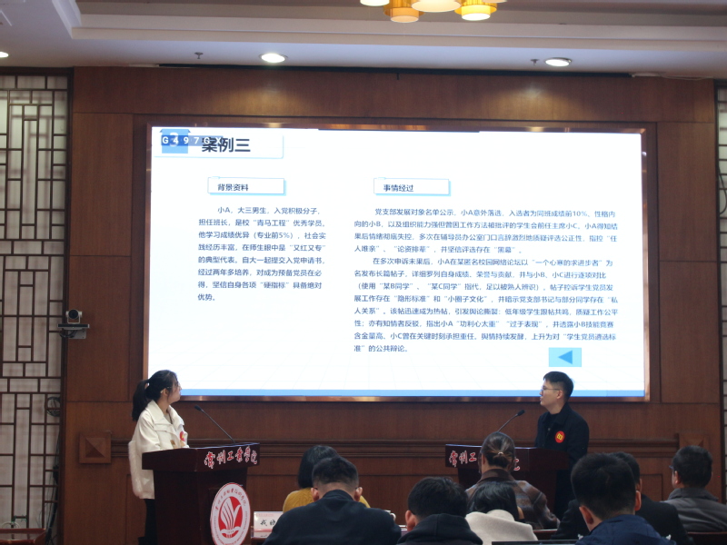 本次大赛遵循省赛规则,分为初赛(基础知识测试)、复赛(案例研讨)和决赛(谈心谈话)三个环节。初赛于11月13日举行,共有73名辅导员参赛。测试采用闭卷笔试作答方式进行,共有20名辅导员脱颖而出,进入复赛。复赛于11月28日举行,采用AB角问答方式进行。比赛以“我提问,你回答”的方式开展,由A、B选手围绕案例共同辨析对策、总结方法。辅导员们思路清晰、分析透彻,展现了应对复杂情境的专业素养与逻辑思辨能力,共有9名选手进入决赛。决赛于12月11日进行,在谈心谈话中,辅导员们情真意切、循循善诱,充分体现了对学生成长的深切关爱与教育智慧。(审核:邢凯岭、李颖、宫乃安)