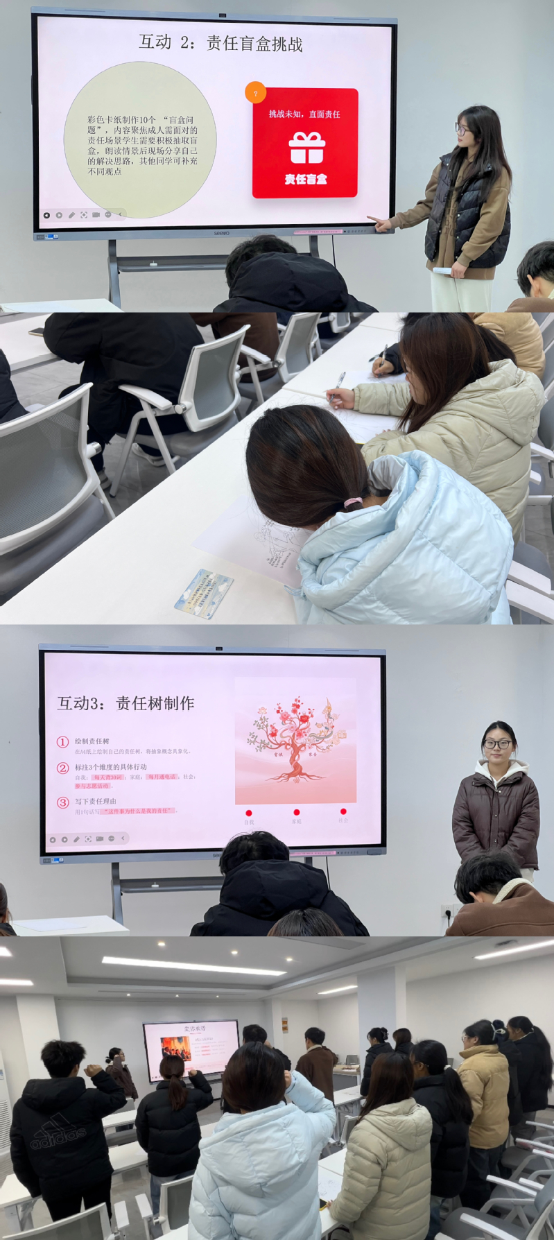 活动紧扣18岁成人的成长特质,从认知、理解、行动三个维度构建沉浸式互动体验。“身份大翻转”环节,学生抽取“孩子的特权”与“成人的责任”主题卡片,结合自身成长经历分享转变的感悟;“责任盲盒挑战”围绕兼职规划、学业平衡、家庭沟通等贴合该群体生活的场景设问,学生抽取盲盒分享解决方案,在同伴互补建议中拓宽责任践行思路;“责任树制作”环节,大家将勤工俭学、完成学业、定期与父母沟通、参与公益回馈社会等行动具象为专属成长规划;“责任瞬间分享”中,学生们讲述在勤工俭学中首次独立解决问题、主动为家庭减负的经历,在情感共鸣中汲取担当力量。压轴环节,全体学生集体宣读《成人责任宣言》,从自我、家庭、社会三个责任维度作出庄严承诺,将责任教育氛围推向高潮。