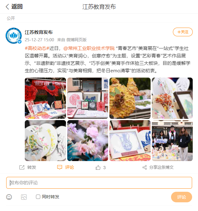 江苏教育发布:#高校动态#常州工业职业技术学院 “青春艺市”美育展开幕