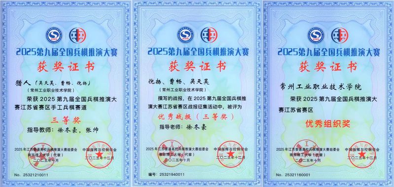 在由南京理工大学主办、南京大学及中国人民解放军陆军工程大学承办的2025年江苏省普通高校兵棋推演大赛上,我校首次亮相便取得不俗成绩。优秀学子倪扬、吴天昊、曹畅组成的代表队荣获手工兵棋赛道三等奖及“优秀战报奖”,学校获得“优秀组织奖”。兵棋推演有助于培养学生战略思维与协同能力,此次参赛也标志着我校在拓展国防教育实践形式、发挥退役大学生士兵特长方面取得了新的进展。