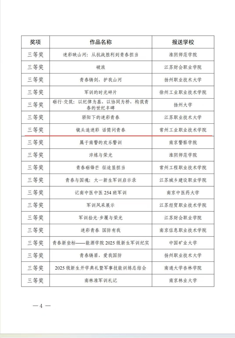 由机械与交通学院高婉君老师指导,学生徐仁志、李世腾创作的军训主题影像作品《镜头追迷彩 话筒问青春》,在2025年“爱我国防”江苏省大学生军训主题影像展示中荣获三等奖。该作品真实记录了学生军训的生动场景与感人瞬间,深刻阐释了军训对于锤炼学生意志、培养集体精神的重要意义。该活动在校内得到了广泛响应,共征集作品15部,展现了我校学生军训工作的丰富成果和学子们的良好风貌。