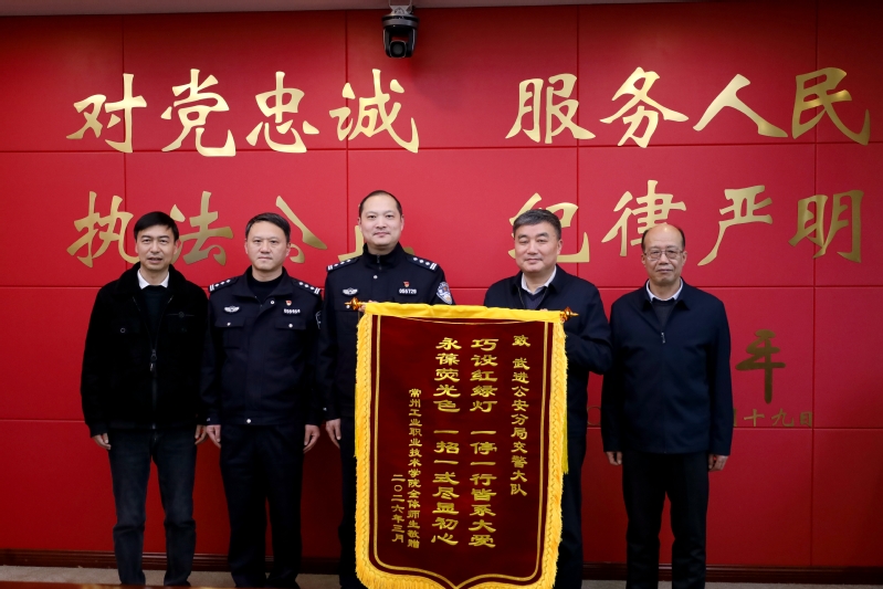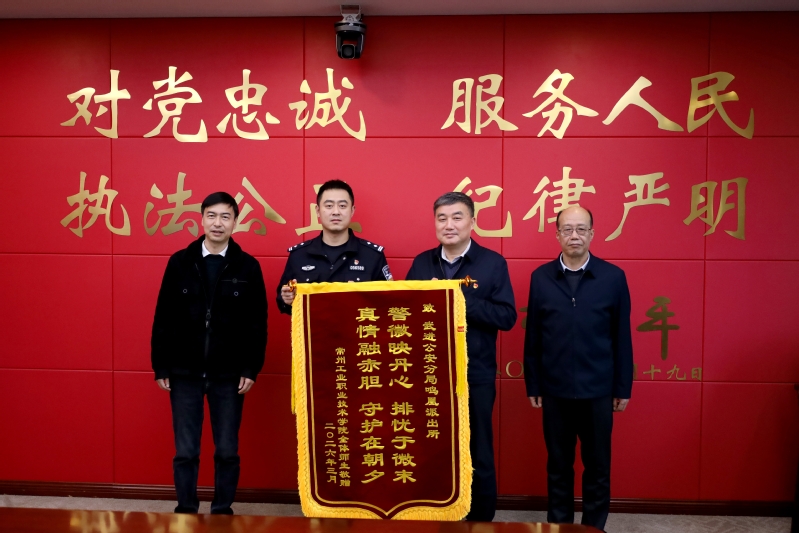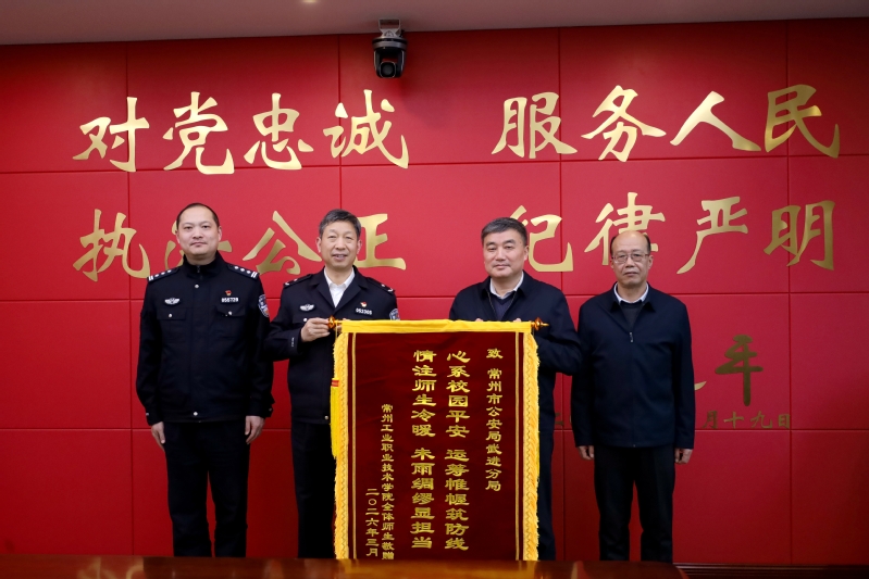 3月19日,我校党委书记席海涛、校长王志华、党委副书记吴丽云一行专程前往常州市公安局武进分局赠旗致谢。常州市公安局党委委员、武进区副区长、武进分局局长盛世麟,副局长马承等热情接待。