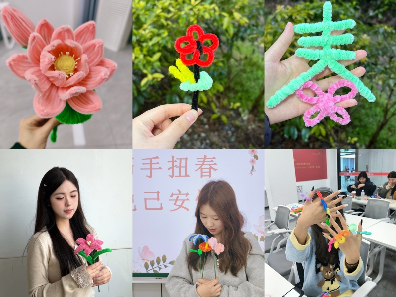 巧手扭春,悦己安怀——扭扭棒DIY。活动现场,工作人员为同学们准备了五颜六色的扭扭棒,耐心演示扭、折、绕等基础技巧,鼓励大家发挥想象力,创作属于自己的春日作品。同学们迅速投入创作,一根根普通的扭扭棒在指尖灵活变幻,逐渐变成了栩栩如生的花朵、充满生机的“春”字造型,还有的同学发挥创意,组合出独具特色的摆件。创作过程中,大家互相交流技巧、分享灵感,不仅收获了亲手创作的成就感,更在互动陪伴中感受到了集体的温暖,有效缓解了学业带来的压力。