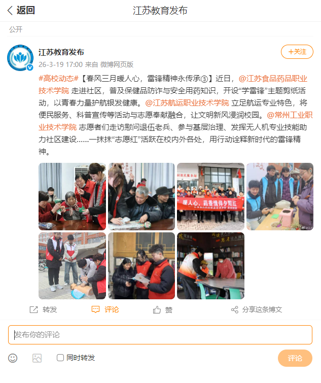 江苏教育发布:#高校动态# 春风三月暖人心,雷锋精神永传承